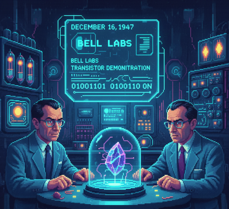 Em 16 de dezembro de 1947, os cientistas do Bell Labs realizaram a primeira demonstração bem-sucedida do transistor. Por apenas um instante, uma pequena peça de metal e cristal substituiu as válvulas gigantes — e venceu. Sem telas touch. Sem processadores i9. Sem inteligência artificial.